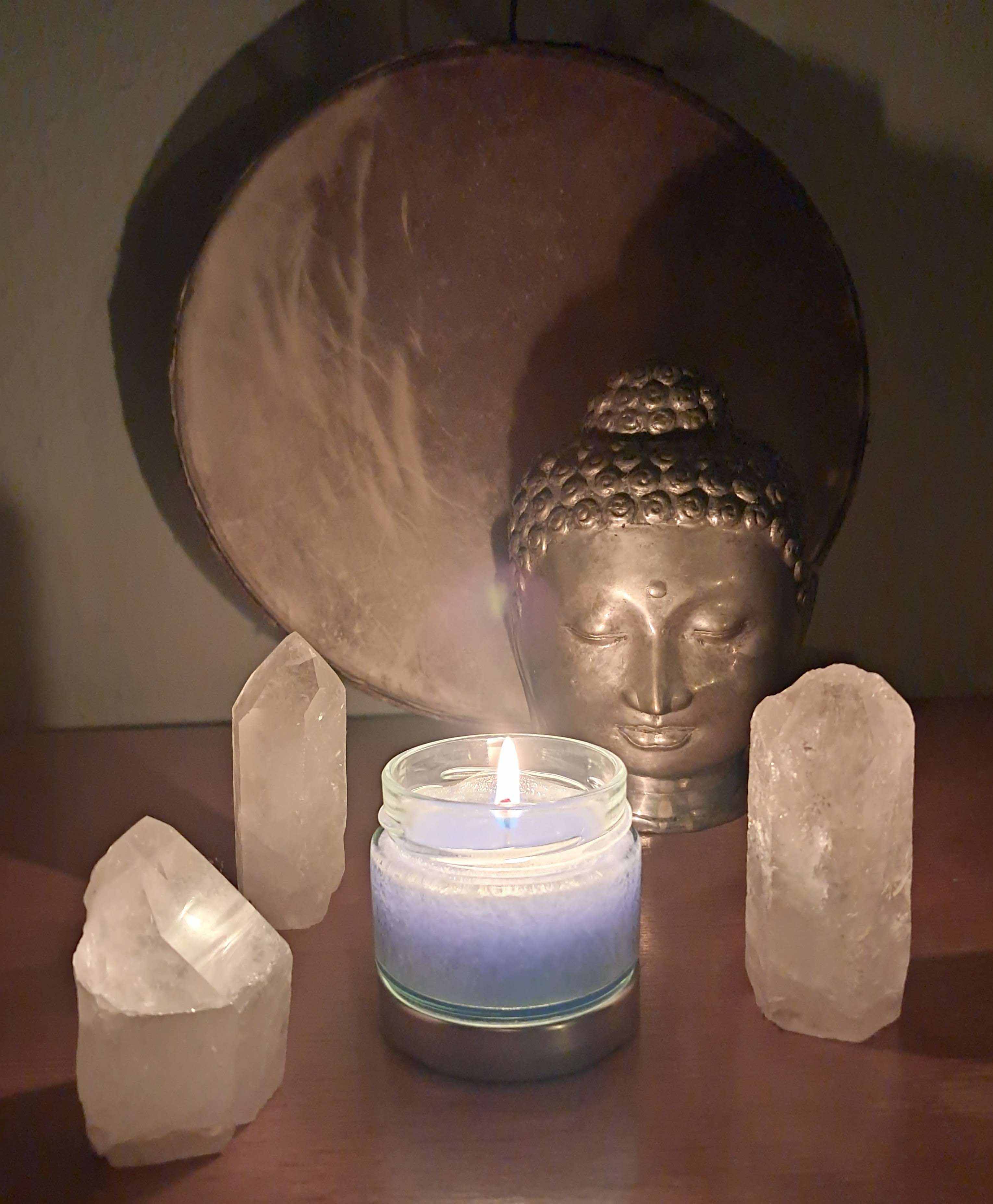 Blaue Kerze im Glas auf hellem Untergrund, umgeben von weißen Federn. Die ruhige Farbwelt und das sanfte Licht schaffen eine friedvolle, klare Stimmung voller Leichtigkeit und innerer Ruhe.