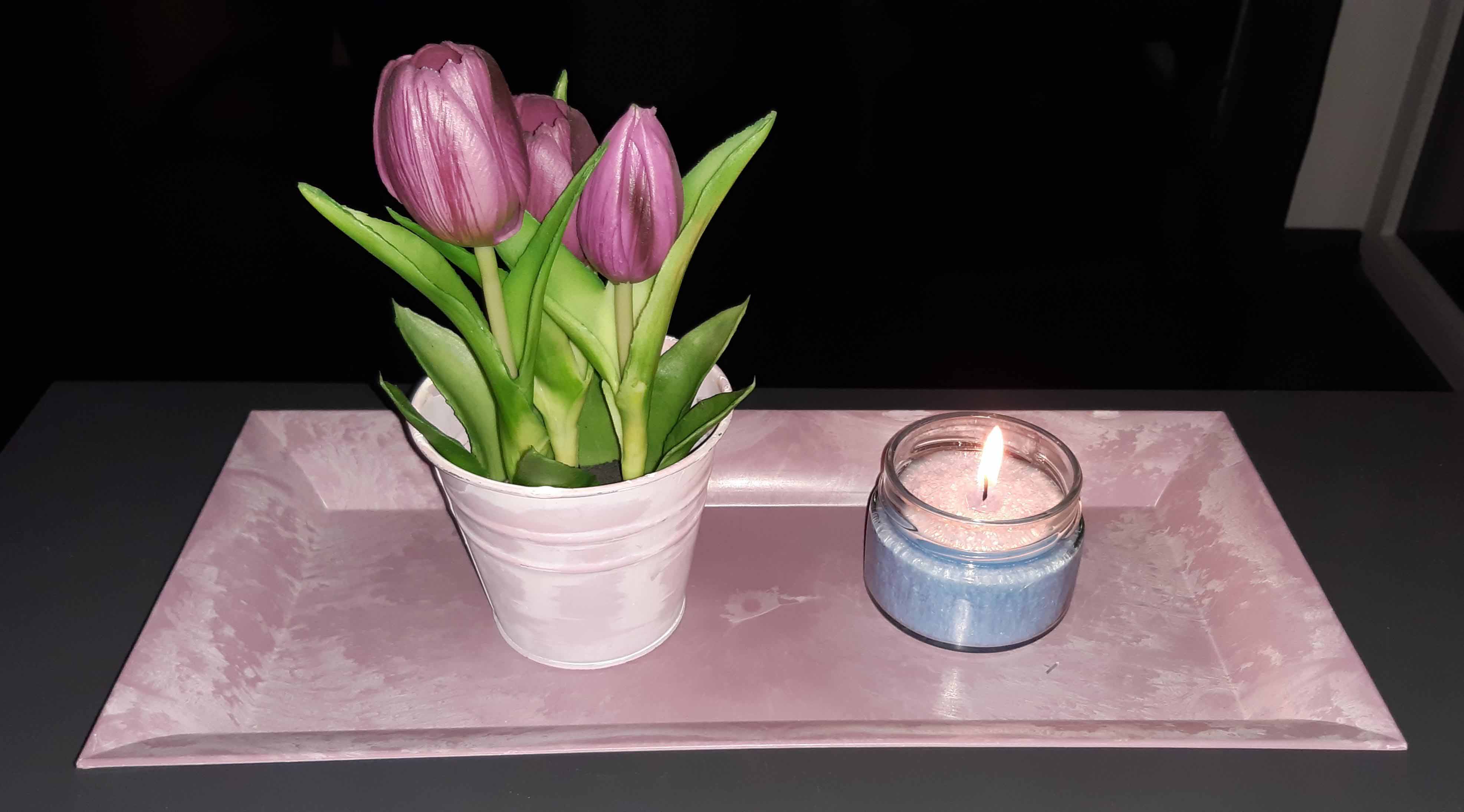 Stimmungsvolle Dekoration mit blauen Kerzen, Blumen und Pflanzen auf einem Sideboard vor Spiegel. Die harmonische Szene verbindet Licht, Natur und Ruhe zu einem liebevollen Wohlfühlort.